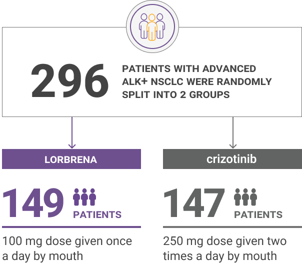 296 patients with ALK+ metastatic NSCLC were randomly split into 2 groups. 149 patients were given LORBRENA (100 mg dose once a day by mouth). 147 patients were given crizotinib (250 mg dose twice a day by mouth).